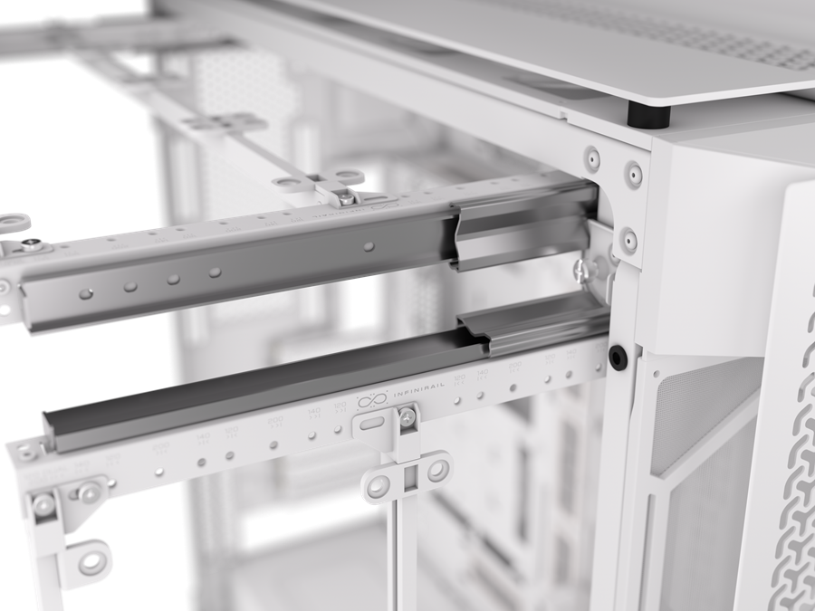 The cavernous interior supports an extensive range of cooling configurations, accommodating up to 18x 120mm, 7x 140mm, or 4x 200mm fans. The front and top panels can mount up to dual 480mm radiators side-by-side, the side of the case can fit a 360mm, and the rear can mount a 240mm radiator, all of which can be mounted in a push-pull configuration depending on the radiator thickness and mount location chosen. The staggering cooling capacity offers multi-system, multi-GPU builders unparalleled flexibility in their preferred cooling solutions. The CORSAIR InfiniRail™ mounting system makes fan installation straightforward, allowing users to simply slide the rails to fit their desired fan diameter and position them over their hottest components, rather than relying on pre-drilled fan mounts.