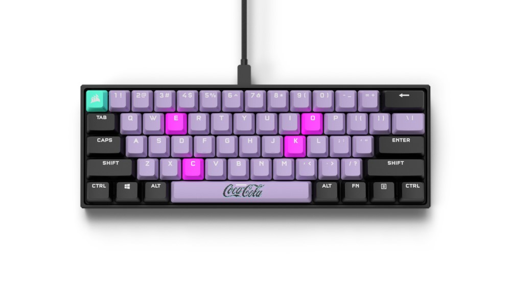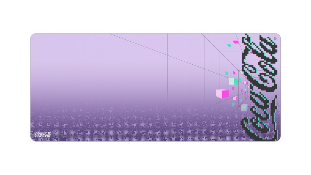 The base colors are lilac and black, and there are unique design elements throughout the entire collection. For example, the pixelated pattern on the mouse pad is layered with light gray to add depth and dimension - a nod to 3D wireframes. The Coca-Cola logo is pixelated, deliberately oversized and is placed directly on the space bar of the K65 keyboard. There’s also an Easter egg hidden on the keyboard. (Hint: Look for the hot pink keys!)
